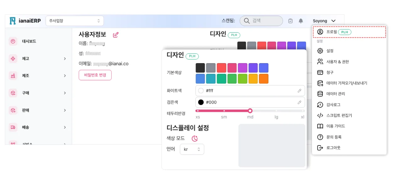 프로필 먼저 오른쪽 상단의 [내 이름] 에서 [프로필] 을 클릭하세요. 사용자정보 이름/성, 비밀번호를 변경하고 [디자인] 에서 기본 색상, 디스플레이, 언어를 설정할 수 있습니다.
