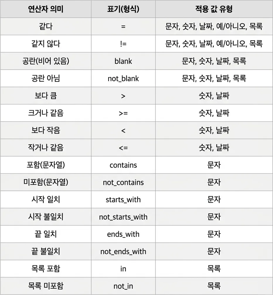 - 값 : 필터 유형에 따라 옵션값은 달라지는데, 필터 유형 ‘속성'은 [아이템] → [속성]에서 설정한 속성 필드로 설정할 수 있습니다.