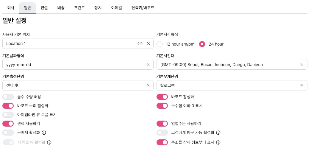 - ‘일반 설정’에서는 업무 등록 시 기본적으로 적용되는 위치, 시간/날짜 형식, 단위를 설정하고 그 밖의 바코드, 소수점 이하 표시, 견적 및 영업주문 사용 여부 등을 설정할 수 있습니다.