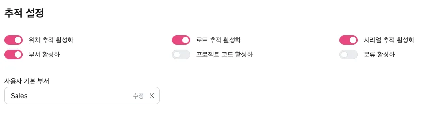 - ‘추적 설정'에서는 아이템의 재고 위치, 로트/시리얼 추적을 허용하거나, 부서 혹은 프로젝트 코드, 분류를 사용할 수 있도록 설정합니다.