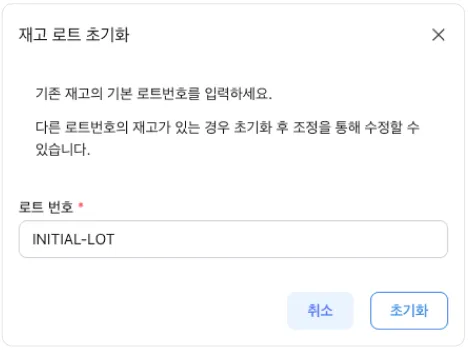 - 재고 로트 초기화를 위해 아래와 같이 로트 번호 “INITIAL-LOT” 텍스트 입력 후 [초기화] 를 눌러주세요.