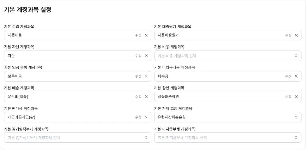 - ‘기본 계정과목 설정'에서는 판매, 구매 등의 업무를 회계 전표에 반영할 때, 분개를 자동화할 수 있도록 계정과목을 설정할 수 있습니다.